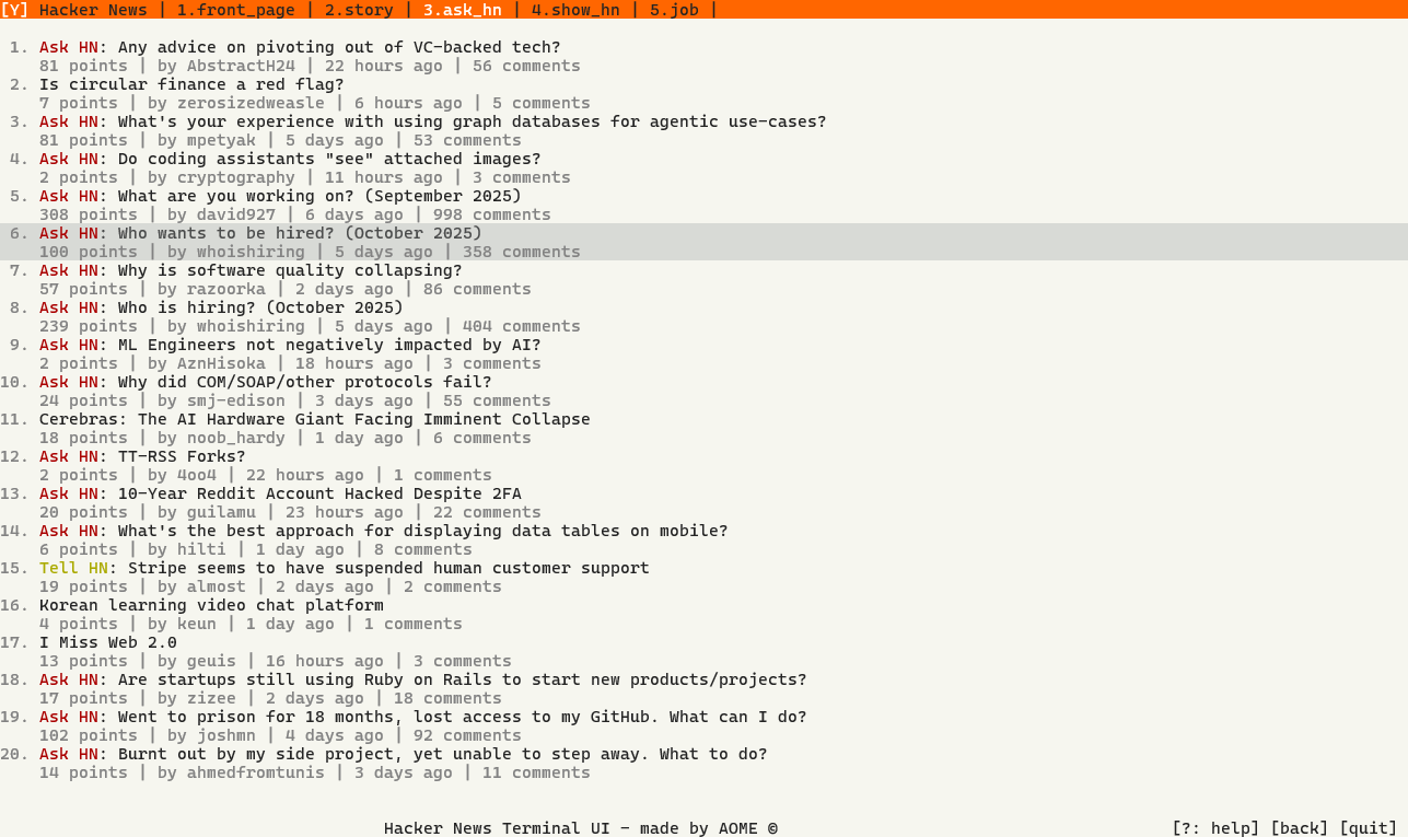Hackernews TUI est une application en interface texte (TUI - Terminal User Interface) qui vous permet de parcourir Hacker News directement depuis votre terminal. Développée en Rust et utilisant la bibliothèque Cursive pour l'interface.