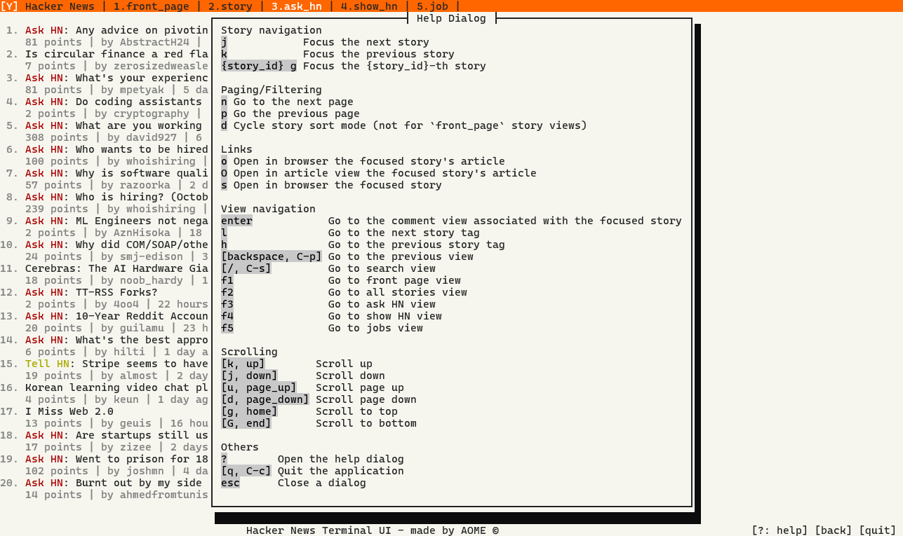 On peut bien sûr afficher les différentes sections d'Hacker News : la une, les posts "Ask HN", "Show HN", et même faire des recherches. Utilisez les raccourcis (F1, F2, F3, ...) pour naviguer dans ces sections.