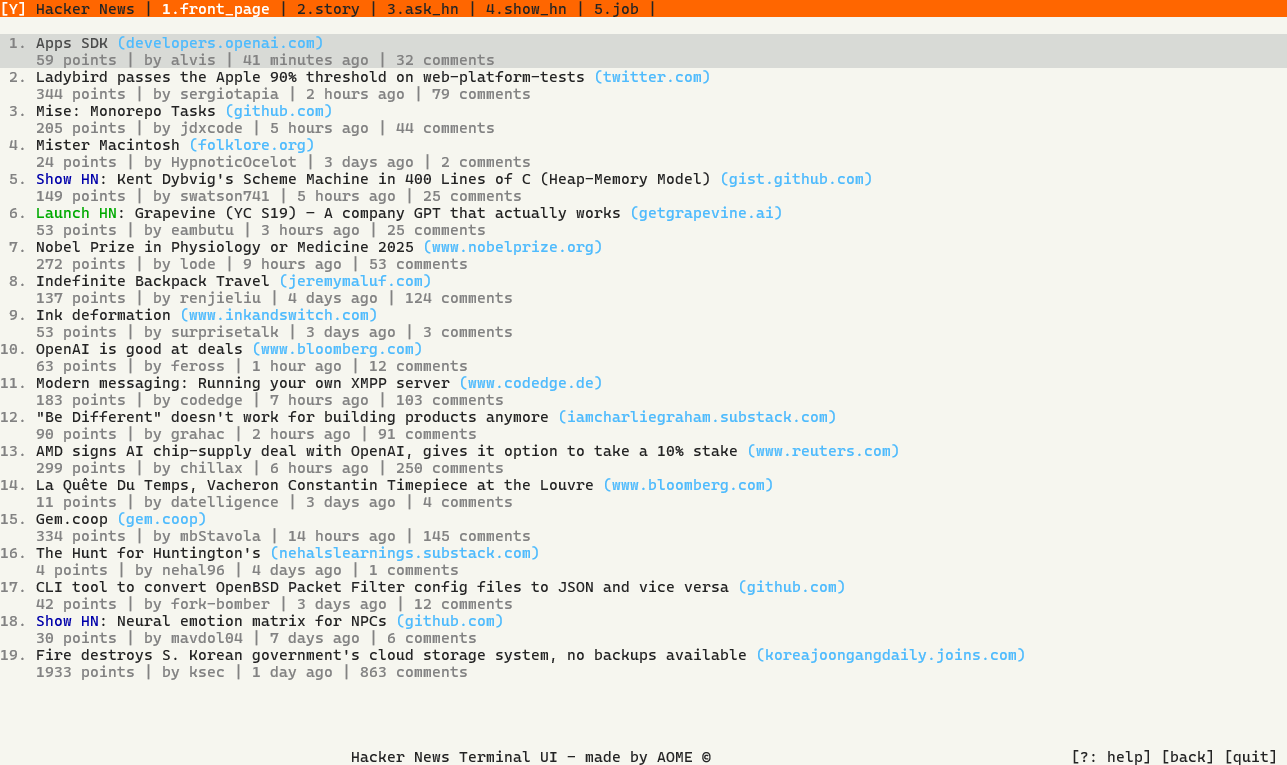 Si vous passez beaucoup de temps dans un terminal et que vous aimez suivre l'actualité tech sur Hacker News, ce projet devrait vous plaire : Hackernews TUI.