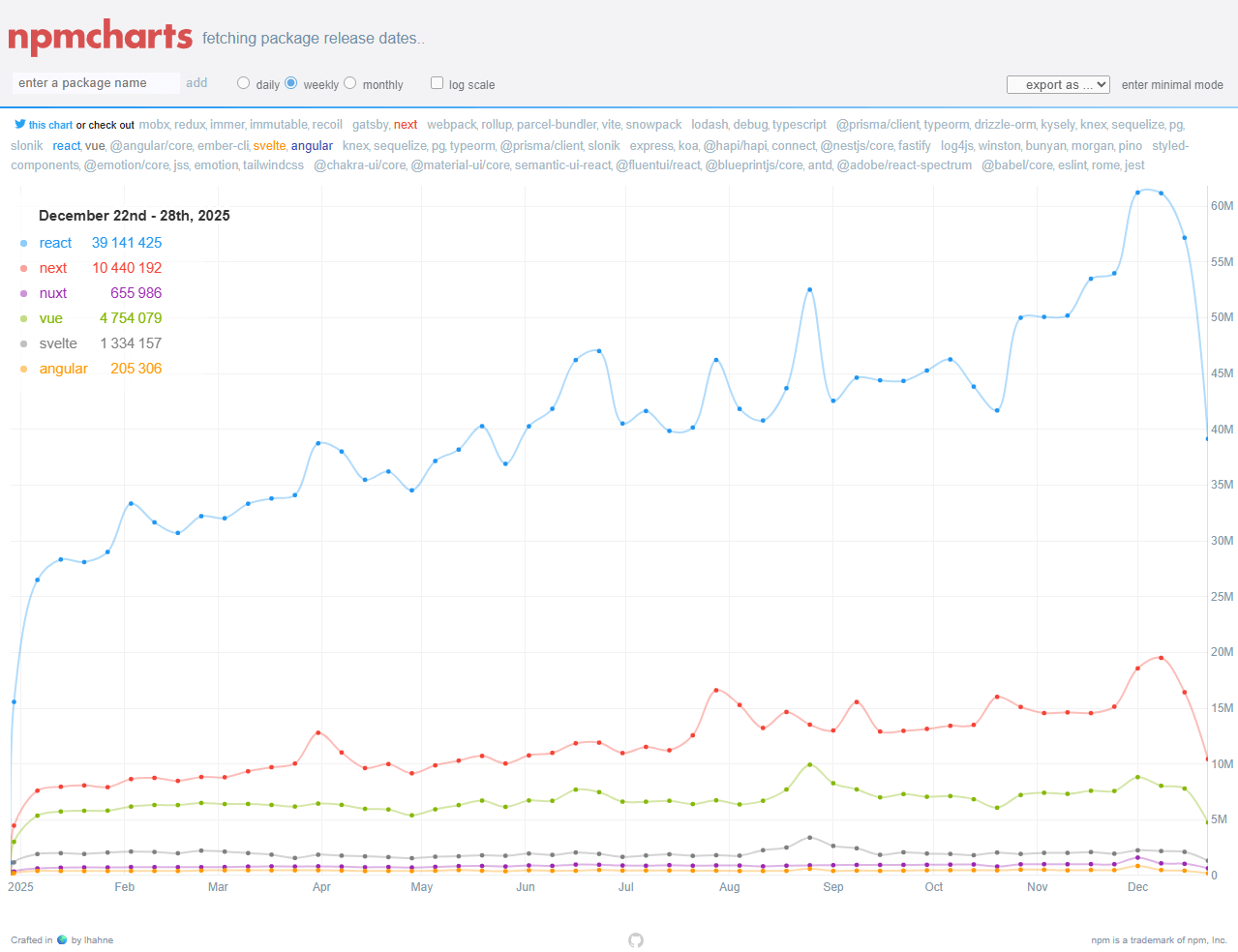 npmcharts est une plateforme de visualisation permettant de comparer les tendances de téléchargement des packages npm au fil du temps. L'outil génère des graphiques interactifs affichant les statistiques de téléchargement de un ou plusieurs packages, ce qui facilite l'analyse comparative entre différentes solutions.