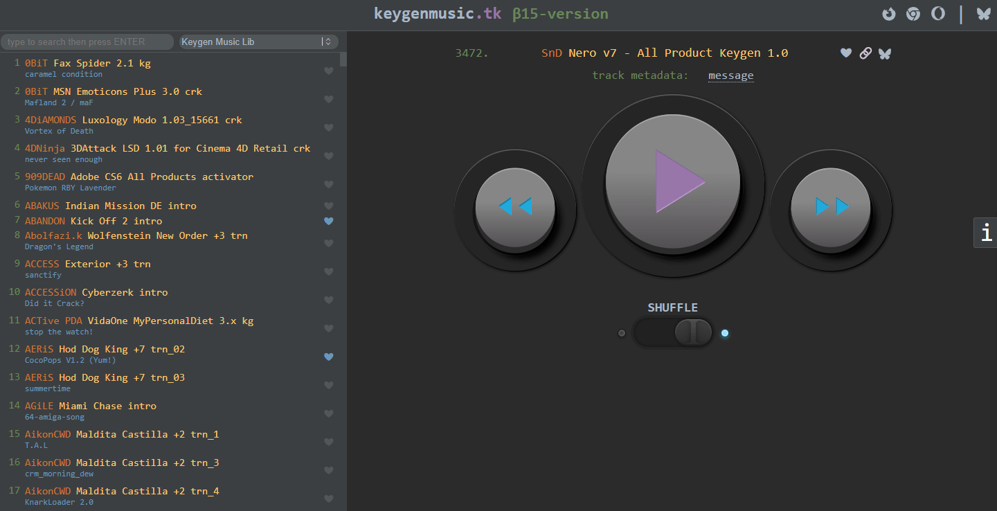 Keygen Music est un lecteur en ligne vous permettant d'écouter les fameuses musiques des keygens. Il rescence tout de même plus de 4500 musiques classées par groupes de crack et par artistes.