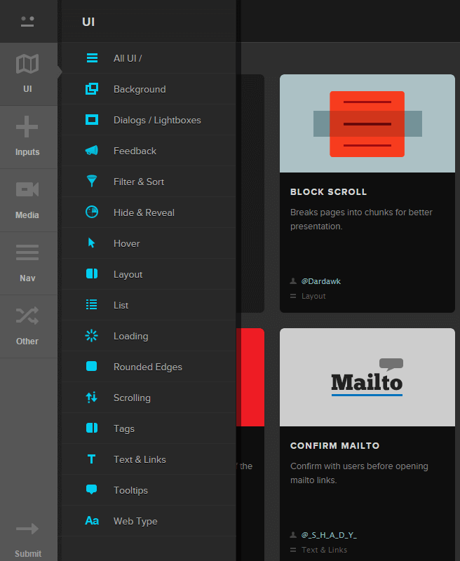 Totalisant à ce jour plus de 1000 plugins, ces derniers sont classés dans plusieurs catégories : UI, Inputs, Media, Nav et Other. A l'intérieur de ces catégories, on retrouve des sous-catégories. Par exemple, pour la catégorie Inputs, on a : Autocomplete, Color pickers, Date & Time, Rate & Vote, et j'en passe.