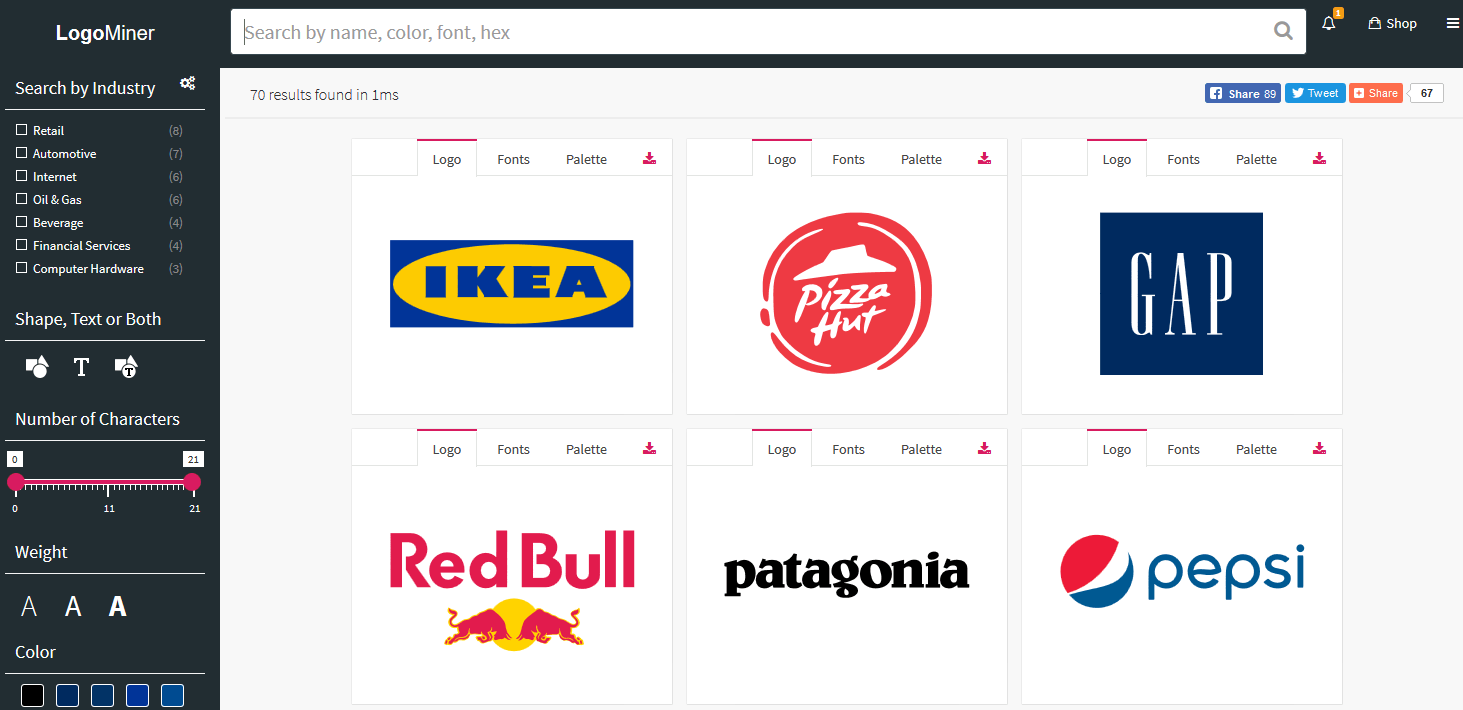 Dans la partie gauche de LogoMiner, vous pouvez effectuer des filtres sur les résultats : type de société (vente, Internet, etc...), nombre de caractères dans le nom de l'entreprise, taille, couleur, ...