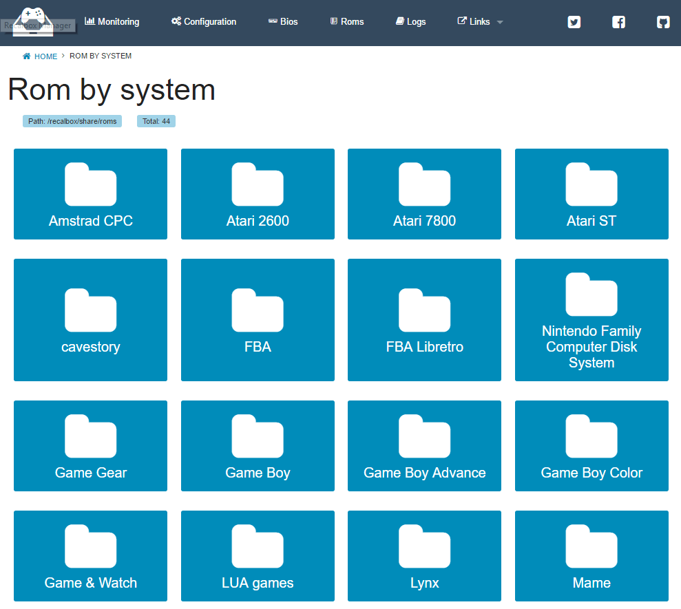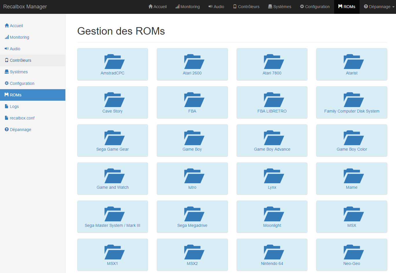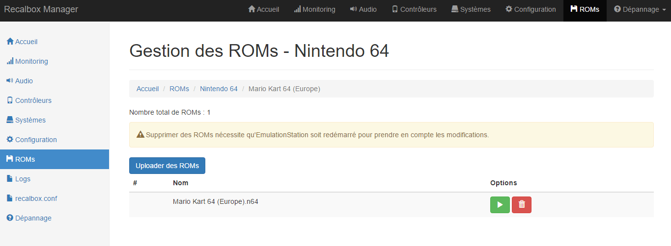 Recalbox fourni par défaut une interface Web permettant de consulter l'état de la machine, de gérer ses roms (= jeux). Cependant, quelques lacunes s'y font ressentir. Celle qui me vient à l'esprit : je gère mes jeux par dossier (psx/Tekken 3/Tekken 3.iso) et l'interface par défaut ne détecte pas cet agencement.