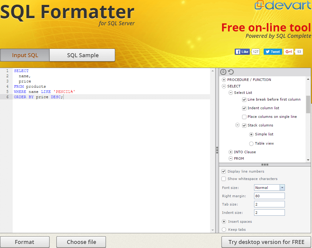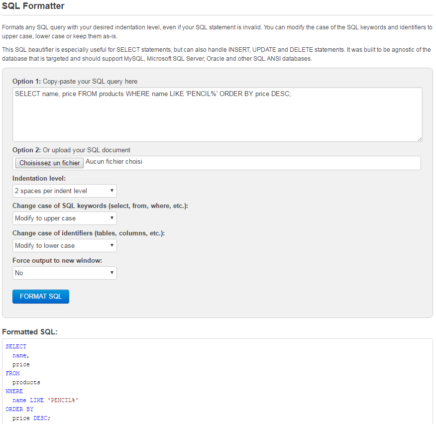 SQL Format est très simple : vous renseignez votre code SQL dans le champ dédié ou téléversez un fichier SQL, peaufinez les quelques options disponibles et votre code SQL est formaté.