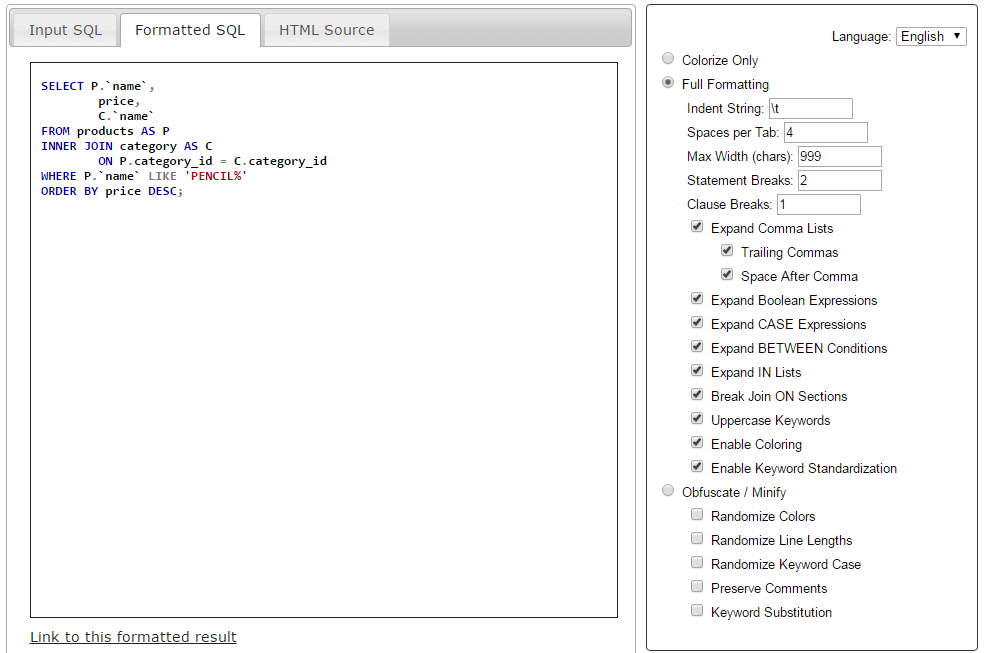 Le principe est identique dans Instant SQL Formatter. L'outil dispose cependant de plus d'options et vous pouvez sélectionner le type de base de données en entrée (MySQL, MSSQL, MS Access, DB2, ...) et également la sortie (formatage MySQL, code PHP, ...).
