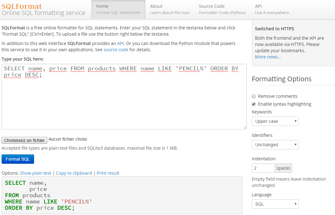 Le site Free Formatter possède un grand nombre d'outils permettant de formater son code. Je vous avez déjà présenté celui pour le JSON. Dans sa version pour le SQL, vous devez inséré votre code dans le champ ou spécifier un fichier sur votre machine. Seulement 4 options sont disponibles (type d'indentation, casse pour les mots-clés ou tables, ...).