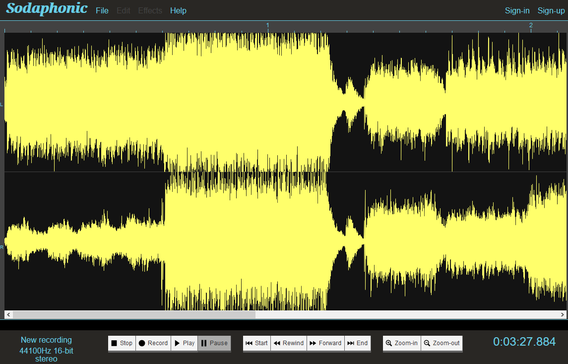 Il y a quelques mois, je vous avais présenté Hya, un autre éditeur audio en ligne. Sodaphonic reprend globalement les mêmes fonctionnalités, à savoir : sélection d'un passage pour le supprimer, copier/coller, appliquer des effets (fade in/out, silence, reverse).
