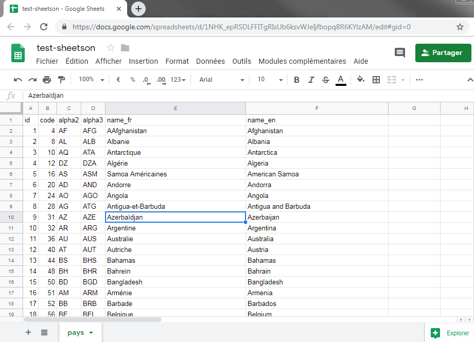 J'ai déjà présenté un service nommé Sheety qui dispose pratiquement des mêmes fonctionnalités. Pour l'exemple, j'ai donc repris la même Sheet que j'avais utilisé dans la présentation de Sheety :