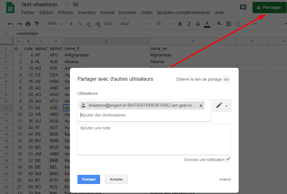 Pour créer une API à partir d'un fichier Google Sheet, le paramétrage est extrêmement simple. A la différence de Sheety où il fallait publier le fichier, avec Sheetson, il vous faut simplement activer le partage et donner en destinataire une adresse spécifique à Sheetson, qui est présente dans la documentation. Lors de mes tests, le destinataire était :