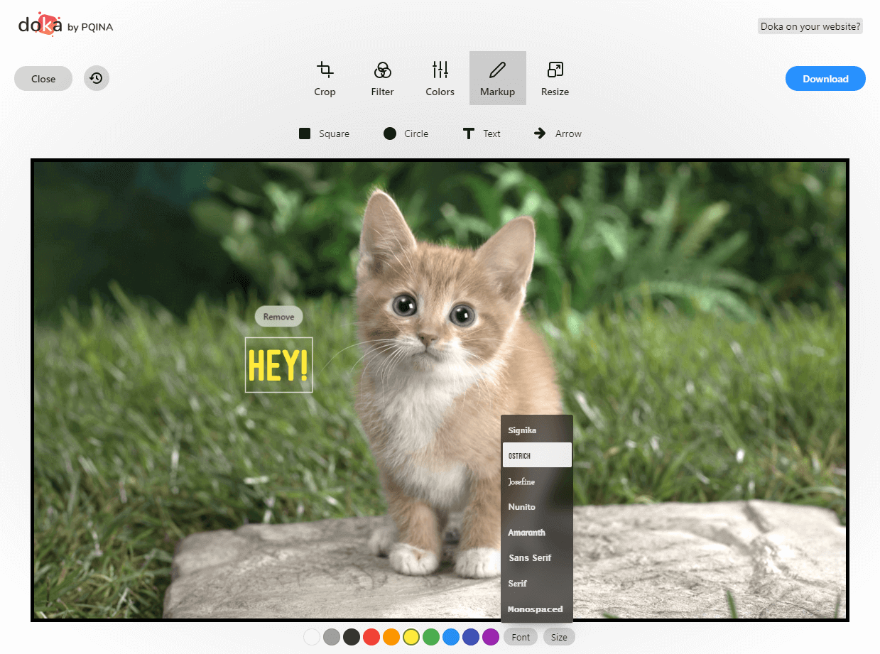 Doka permet également d'annoter votre image en ajoutant une forme (carré/rectangle, cercle, flèche) ou un texte. Avec ce dernier, vous pourrez choisir une typo parmi 8 fournies, la taille et la couleur.