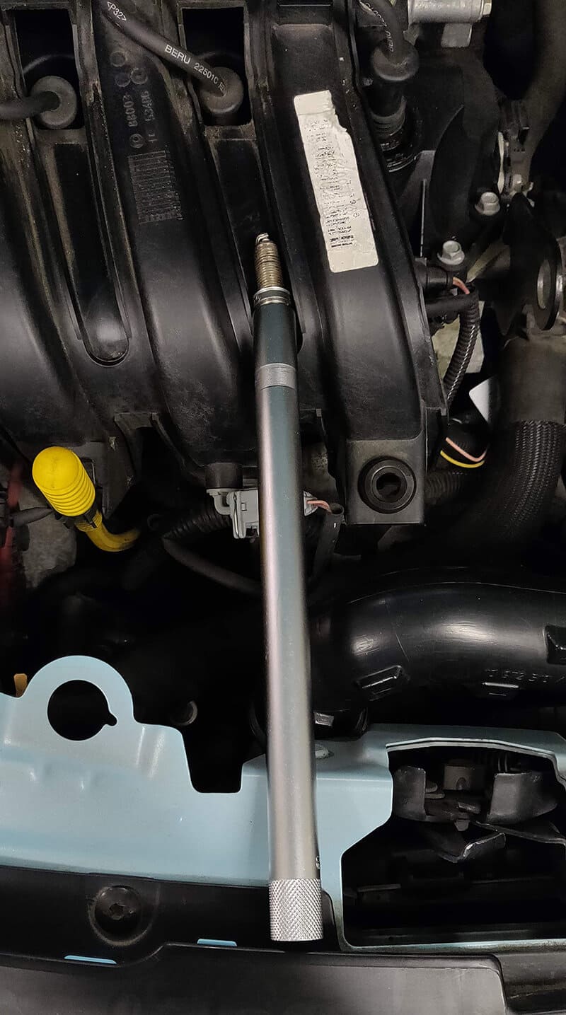 Installez la nouvelle bougie dans la douille et plongez-la dans le puit. Serrez la bougie fermement. Idéalement, si vous avez une clé dynamométrique, serrez au couple prescrit par le fabriquant de la bougie. Le couple est généralement mentionné sur le petit carton de la bougie ou alors sur le site Internet du fabricant. Sinon, serrez à 23 ou 24 Nm.