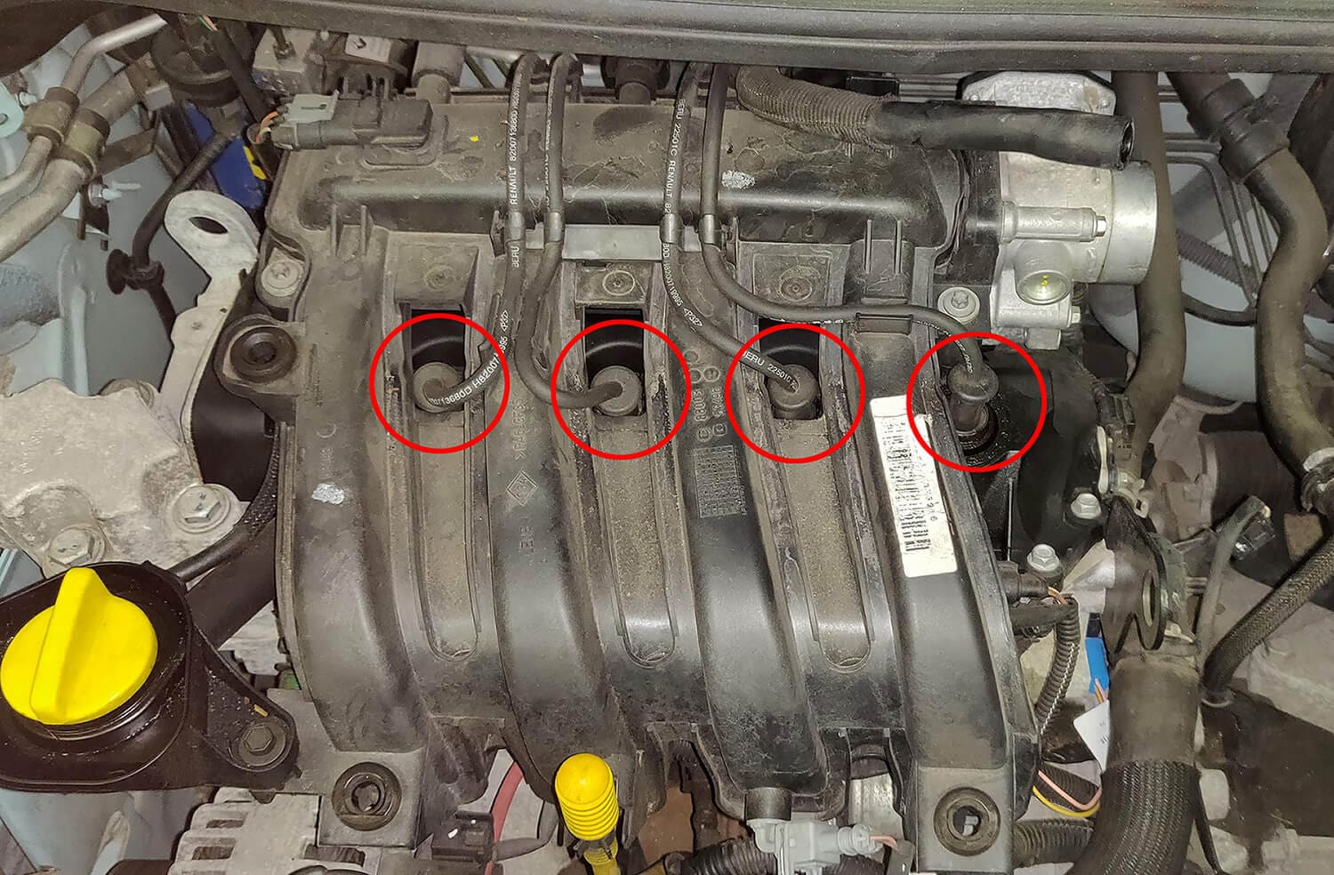 Une fois le boîtier du filtre à air retiré, vous avez accès aux bougies sous les anti-parasites (entourés en rouge) :