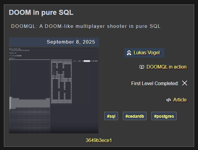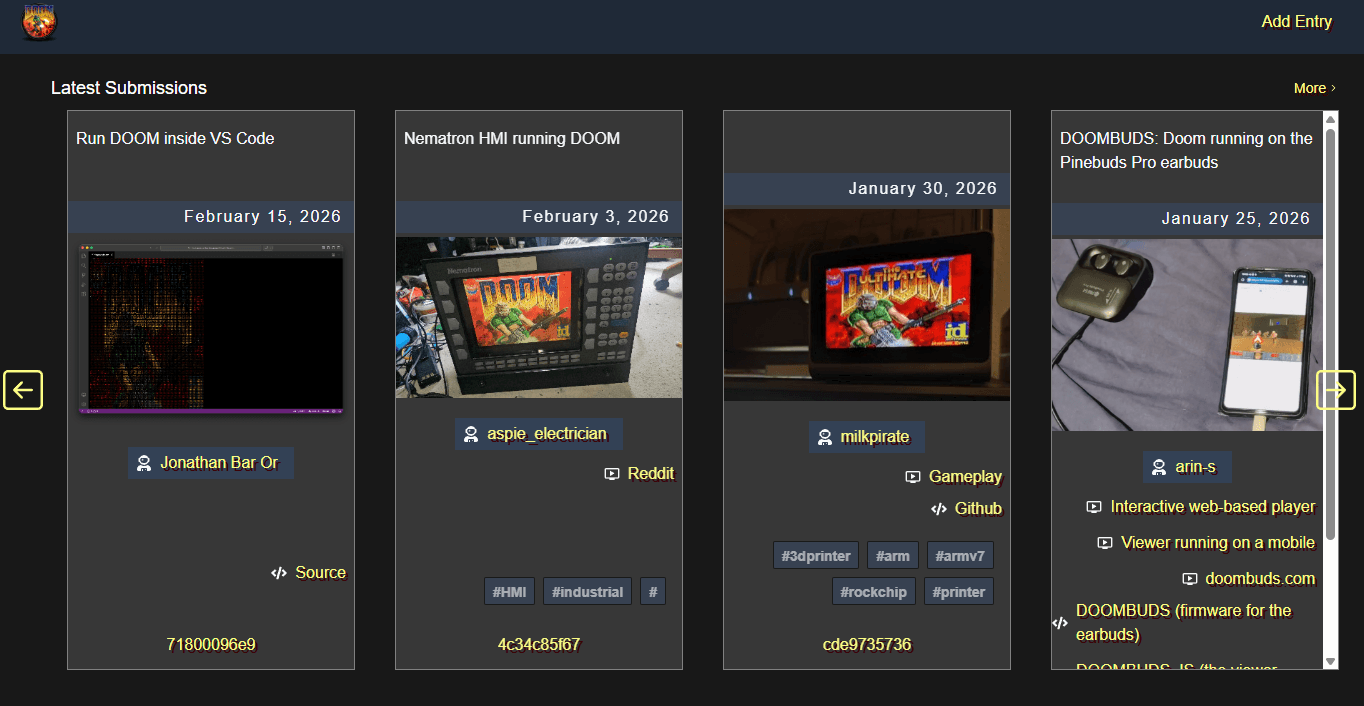 Can It Run Doom ? catalogue plus de 200 entrées, chacune documentée avec une description, le nom de l'auteur du port, des captures d'écran ou vidéos, la date de publication et un lien vers la source. Les entrées sont organisées par catégories, dont une dédiée aux ports "Baremetal", c'est-à-dire les versions faisant tourner Doom directement sur le matériel, sans système d'exploitation intermédiaire.